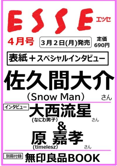 【3/2発売】「ESSE 2026年 4月号」表紙:佐久間大介(Snow Man)