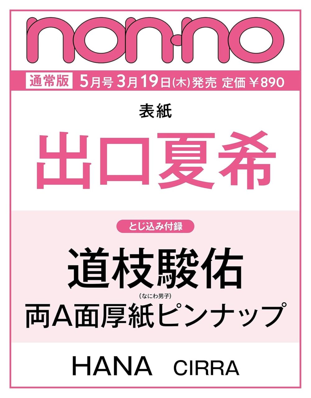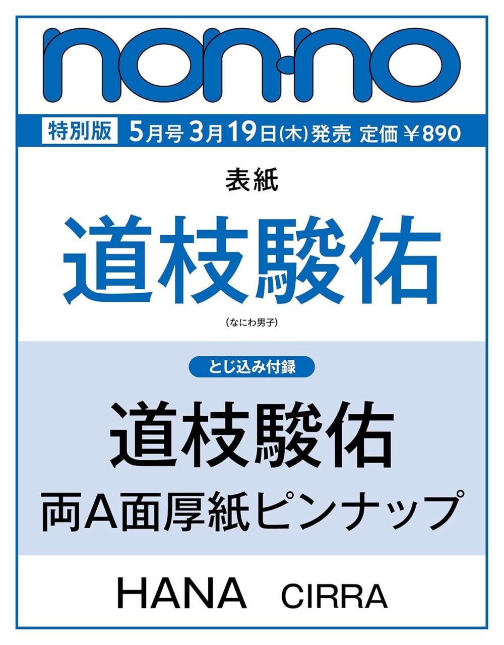 amazon.co.jp 【3/19発売】「non-no 2026年 5月号 増刊 SPECIAL EDITION」表紙:道枝駿佑(なにわ男子) ポストする シェアする LINEで送る 更新日 : 2026年3月19日(木) non-no 集英社 月刊(毎月20日) 公式サイト 公式SNS ▼バックナンバー検索 Amazon 楽天ブックス 楽天市場 non-no(ノンノ) 2026年 5月号 増刊 SPECIAL EDITION / 通常版【特別版】表紙道枝駿佑(なにわ男子)【通常版】表紙出口夏希とじ込み付録道枝駿佑(なにわ男子) 両A面厚紙ピンナップ Amazonで見る楽天ブックスで見る楽天市場で見る 紙版を購入 販売期間や在庫状況により、リンク先のショップで購入できない場合があります。ご了承ください。
