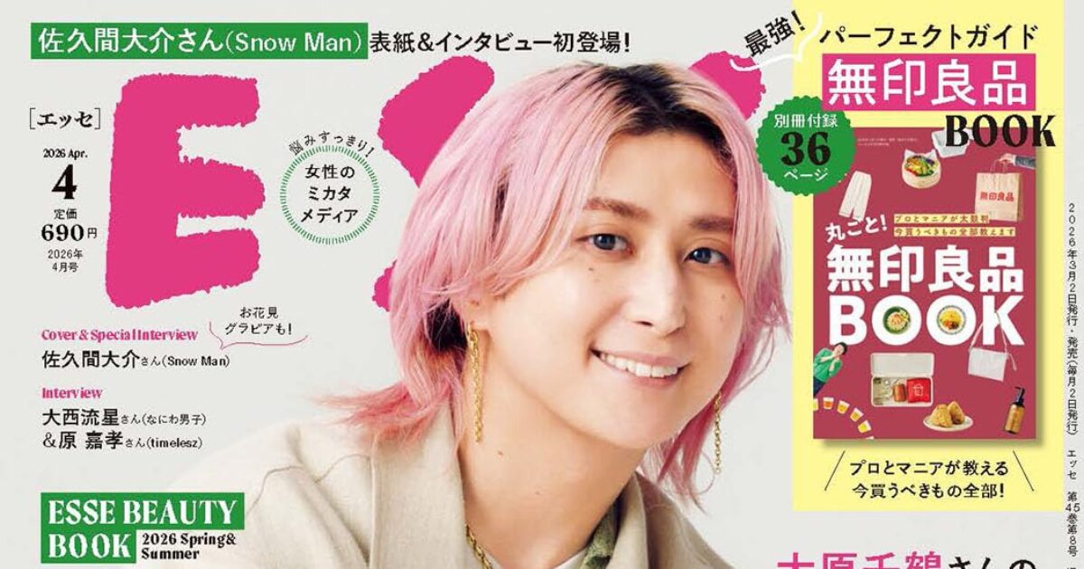 amazon.co.jp 【3/2発売】「ESSE 2026年 4月号」表紙:佐久間大介(Snow Man) ポストする シェアする LINEで送る 更新日 : 2026年3月2日(月) ESSE 扶桑社 月刊(毎月2日) 公式サイト 公式SNS ▼バックナンバー検索 Amazon 楽天ブックス 楽天市場 ESSE(エッセ) 2026年 4月号表紙・スペシャルインタビュー佐久間大介(Snow Man)インタビュー大西流星(なにわ男子) × 原嘉孝(timelesz)別冊付録無印良品BOOK Amazonで見るKindle版(電子書籍)楽天ブックスで見る楽天Kobo版(電子書籍)楽天市場で見る 紙版を購入 電子書籍版を購入 販売期間や在庫状況により、リンク先のショップで購入できない場合があります。ご了承ください。