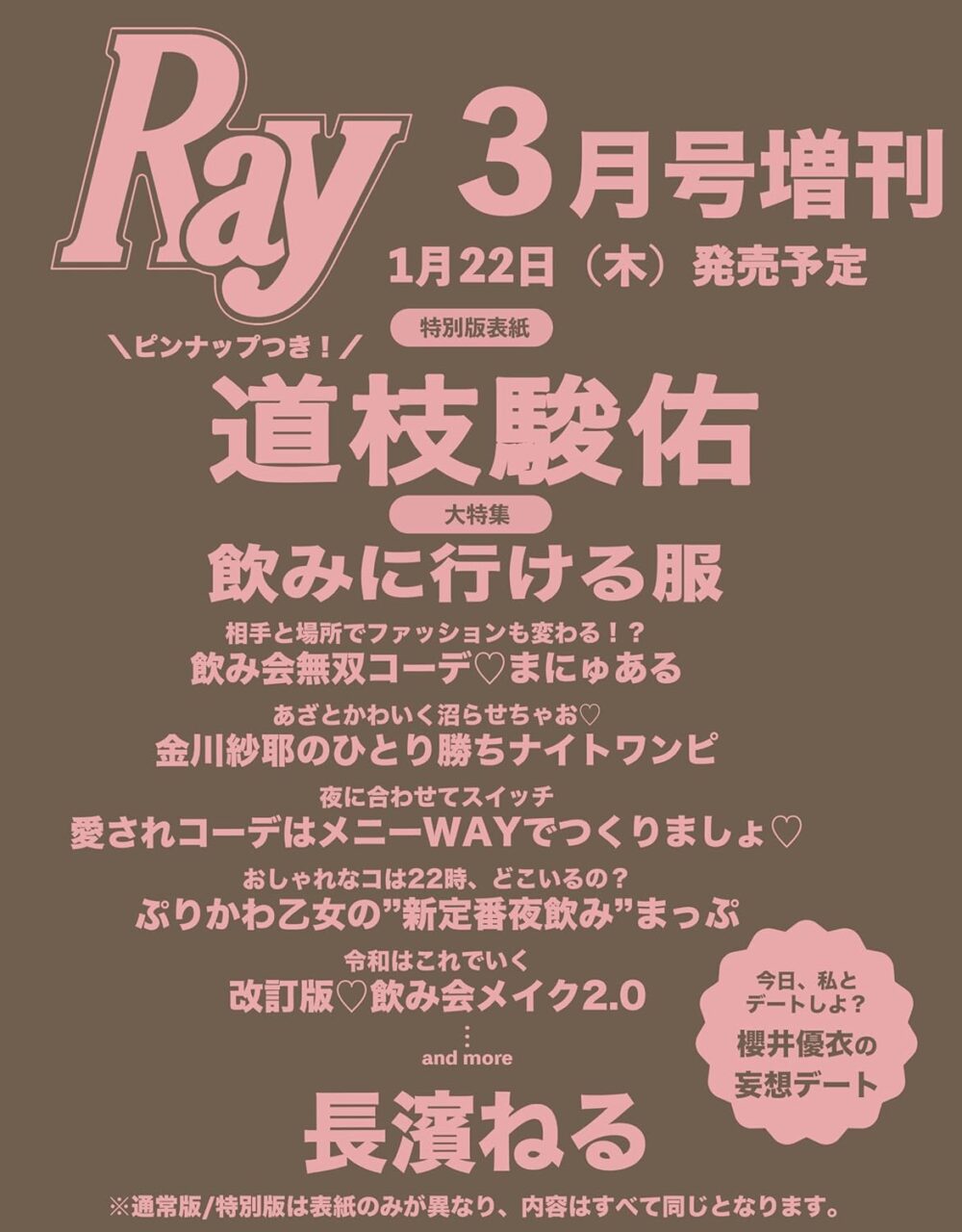 amazon.co.jp 【1/22発売】「Ray 2026年 3・4月 合併号 特別版」表紙:道枝駿佑(なにわ男子) ポストする シェアする LINEで送る 更新日 : 2026年1月22日(木) Ray 主婦の友社 月刊(毎月23日) 公式サイト 公式SNS ▼バックナンバー検索 Amazon 楽天ブックス 楽天市場 Ray(レイ) 2026年 3・4月 増刊 特別版 / 通常版【特別版】表紙・ピンナップ道枝駿佑(なにわ男子)みっちーが好きすぎる!【通常版】表紙長濱ねる特集急なお誘いもおまかせあれ♡飲みに行ける服 Amazonで見る楽天ブックスで見る楽天市場で見る 紙版を購入 販売期間や在庫状況により、リンク先のショップで購入できない場合があります。ご了承ください。