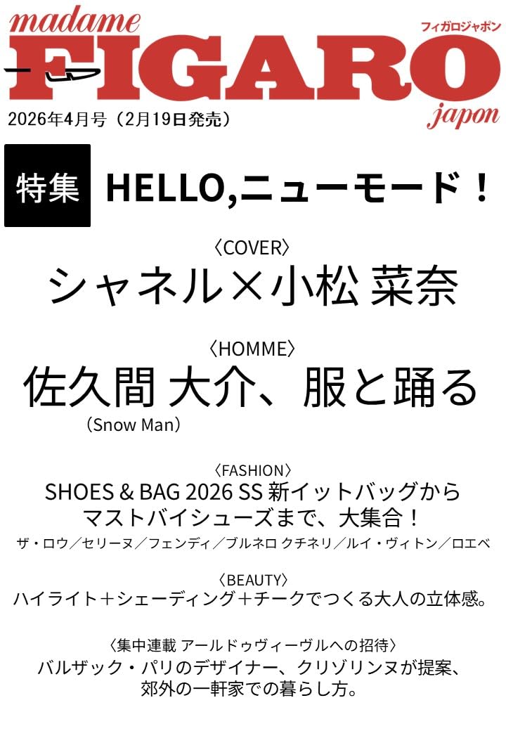 amazon.co.jp 【2/19発売】「フィガロジャポン 2026年 4月号」掲載:佐久間大介(Snow Man) ポストする シェアする LINEで送る 更新日 : 2026年1月31日(土) madame FIGARO japon CCCメディアハウス 月刊(毎月20日) 公式サイト 公式SNS ▼バックナンバー検索 Amazon 楽天ブックス 楽天市場 madame FIGARO japon(フィガロジャポン) 2026年 4月号表紙シャネル × 小松奈菜特集Hello, ニューモード!掲載佐久間大介(Snow Man) Amazonで見る楽天市場で見る 紙版を購入 販売期間や在庫状況により、リンク先のショップで購入できない場合があります。ご了承ください。