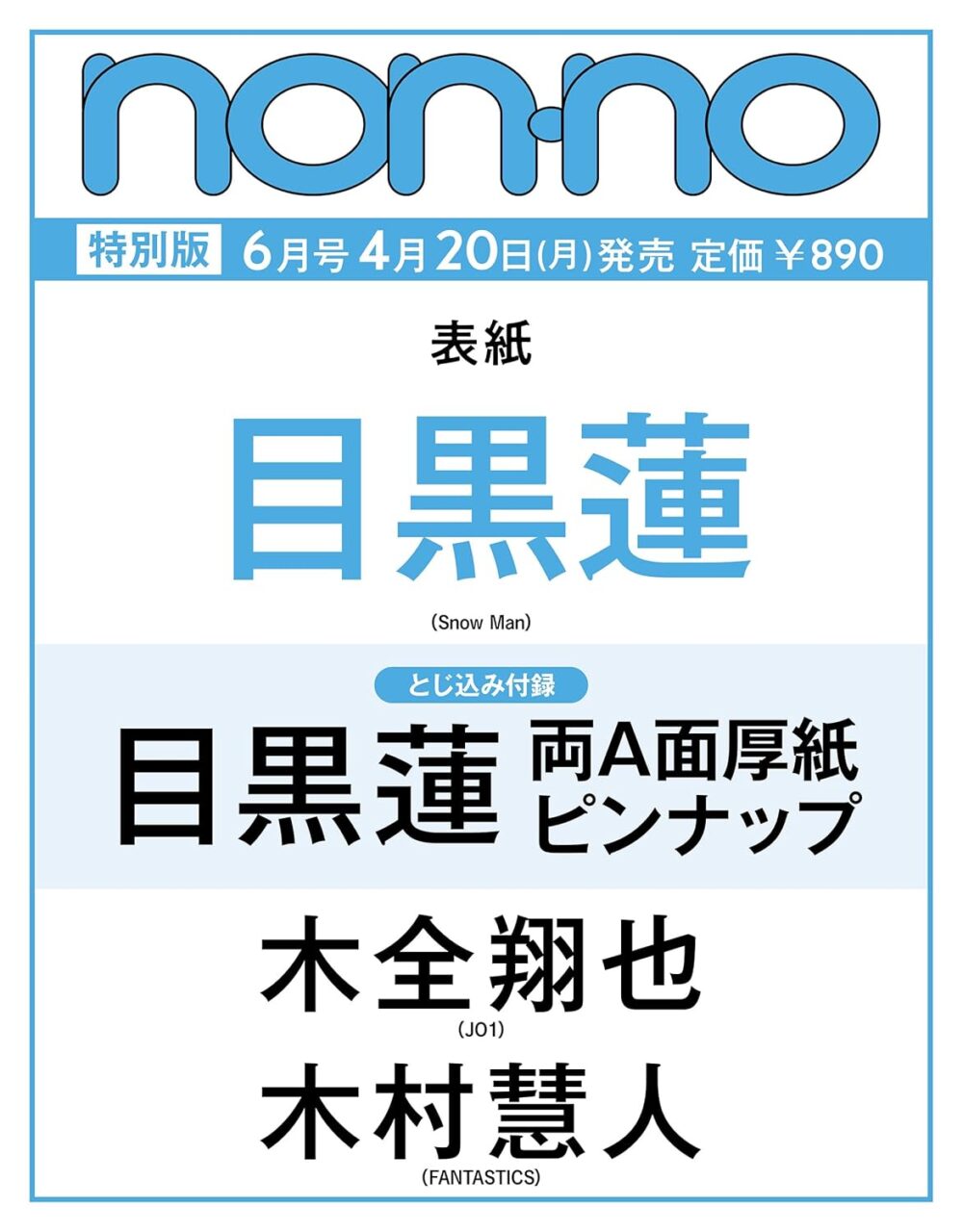 amazon.co.jp 【4/20発売】「non-no 2026年 6月号増刊 特別版」表紙:目黒蓮(Snow Man) ポストする シェアする LINEで送る 更新日 : 2026年3月19日(木) non-no 集英社 月刊(毎月20日) 公式サイト 公式SNS ▼バックナンバー検索 Amazon 楽天ブックス 楽天市場 non-no(ノンノ) 2026年 6月号増刊 特別版 / 通常版【特別版】表紙目黒蓮(Snow Man)【通常版】表紙井上和(乃木坂46)とじ込み付録目黒蓮(Snow Man) 両A面厚紙ピンナップ Amazonで見る楽天ブックスで見る楽天市場で見る 紙版を購入 販売期間や在庫状況により、リンク先のショップで購入できない場合があります。ご了承ください。