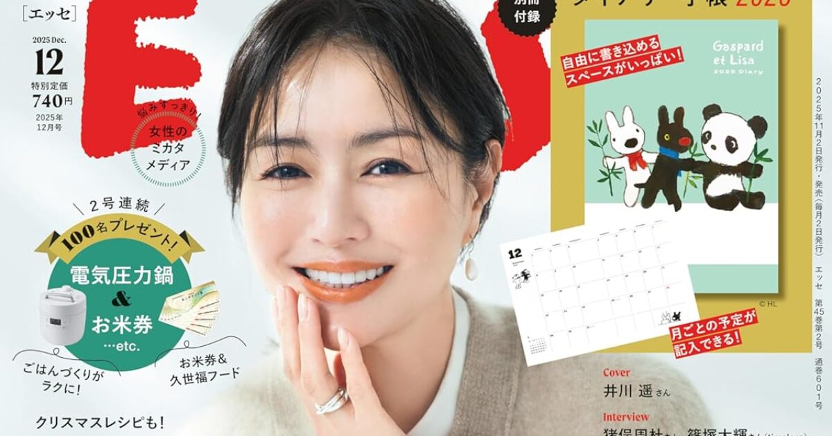 amazon.co.jp 【11/4発売】「ESSE 2025年 12月号」掲載:猪俣周杜 × 篠塚大輝(timelesz) 七五三掛龍也(Travis Japan) ポストする シェアする LINEで送る 更新日 : 2025年11月4日(火) ESSE 扶桑社 月刊(毎月2日) 公式サイト 公式SNS ▼バックナンバー Amazonで検索 楽天ブックスで検索 楽天市場で検索 ESSE(エッセ) 2025年 12月号表紙井川遥巻頭特集こんまりさんが教える!いつも家がきれいな人の7つの共通点見つけた!インタビュー猪俣周杜 × 篠塚大輝(timelesz)佐藤流司掲載磯山さやか連載七五三掛龍也(Travis Japan)別冊付録リサとガスパール ダイアリー手帳2026 Amazonで見るKindle版(電子書籍)楽天ブックスで見る楽天Kobo版(電子書籍)楽天市場で見る 紙版を購入 電子書籍版を購入 販売期間や在庫状況により、リンク先のショップで購入できない場合があります。ご了承ください。