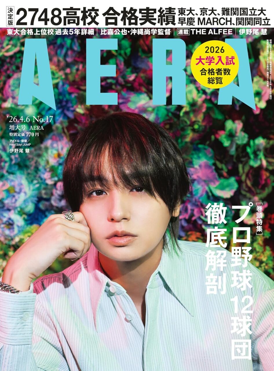amazon.co.jp 【3/30発売】「AERA 2026年 4/6 増大号 No.17」表紙:伊野尾慧(Hey! Say! JUMP) ポストする シェアする LINEで送る 更新日 : 2026年3月30日(月) AERA 朝日新聞出版 週刊(毎週月曜日) 公式サイト 公式SNS ▼バックナンバー検索 Amazon 楽天ブックス 楽天市場 AERA(アエラ) 2026年 4/6 増大号 No.17表紙・グラビア・ロングインタビュー伊野尾慧(Hey! Say! JUMP)撮影◎蜷川実花巻頭特集プロ野球12球団徹底解剖 Amazonで見るKindle版(電子書籍)楽天ブックスで見る楽天Kobo版(電子書籍)楽天市場で見る 紙版を購入 電子書籍版を購入 販売期間や在庫状況により、リンク先のショップで購入できない場合があります。ご了承ください。