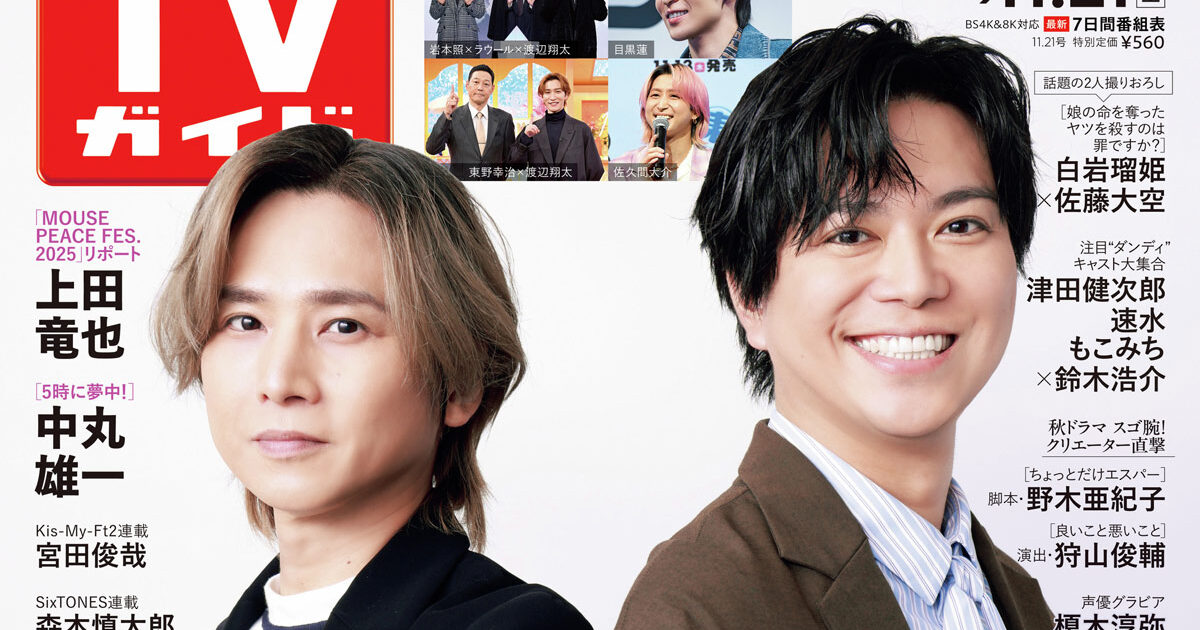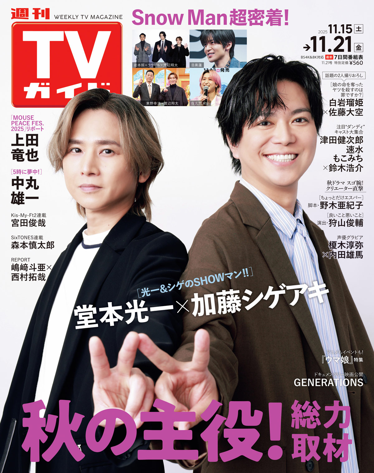 amazon.co.jp 【11/12発売】「週刊TVガイド 2025年 11/21号」表紙:堂本光一 × 加藤シゲアキ ポストする シェアする LINEで送る 更新日 : 2025年11月12日(水) 週刊TVガイド 東京ニュース通信社 週刊(毎週水曜日) 公式サイト 公式SNS ▼バックナンバー Amazonで検索 楽天ブックスで検索 楽天市場で検索 週刊TVガイド 2025年 11/21号表紙堂本光一 × 加藤シゲアキ『光一&シゲのSHOWマン!!』 Amazonで見るKindle版(電子書籍)楽天ブックスで見る楽天Kobo版(電子書籍)楽天市場で見る 紙版を購入 電子書籍版を購入 販売期間や在庫状況により、リンク先のショップで購入できない場合があります。ご了承ください。