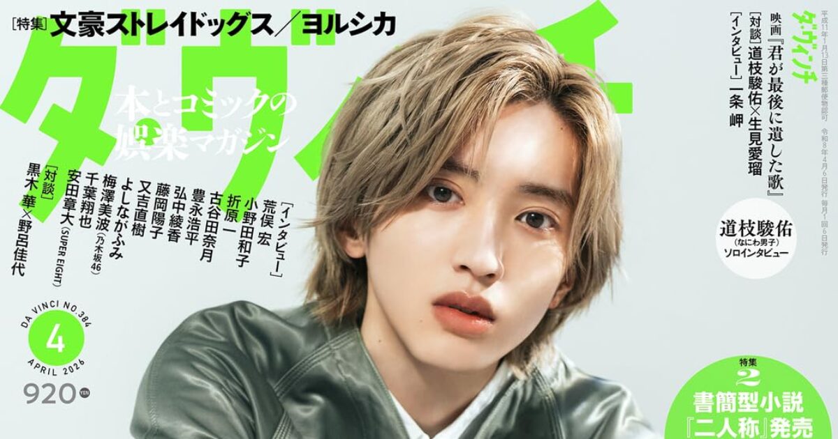 amazon.co.jp 【3/6発売】「ダ・ヴィンチ 2026年 4月号」表紙:道枝駿佑(なにわ男子) ポストする シェアする LINEで送る 更新日 : 2026年2月27日(金) ダ・ヴィンチ KADOKAWA 月刊(毎月6日) 公式サイト 公式SNS ▼バックナンバー検索 Amazon 楽天ブックス 楽天市場 ダ・ヴィンチ 2026年 4月号表紙・インタビュー道枝駿佑(なにわ男子)特集1最新刊発売&アニメシリーズ10周年!『文豪ストレイドッグス』道しるべは、言葉特集2書簡型小説『二人称』発売&連動アルバムついにリリース!私たちをつなぐ、ヨルシカ Amazonで見る楽天ブックスで見る楽天市場で見る 紙版を購入 販売期間や在庫状況により、リンク先のショップで購入できない場合があります。ご了承ください。