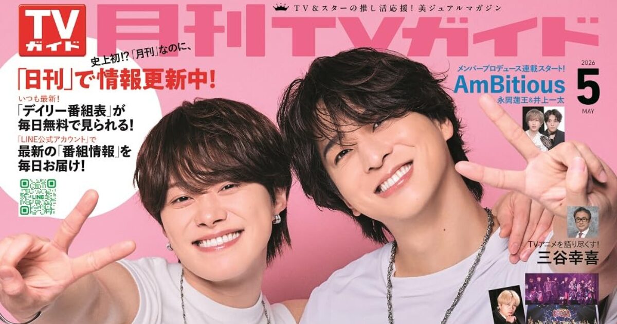 amazon.co.jp 【3/24発売】「月刊TVガイド 2026年 5月号」表紙:大橋和也(なにわ男子) × 寺西拓人(timelesz) ポストする シェアする LINEで送る 更新日 : 2026年3月24日(火) 月刊TVガイド 東京ニュース通信社 月刊(毎月24日) 公式サイト 公式SNS ▼バックナンバー検索 Amazon 楽天ブックス 楽天市場 月刊TVガイド 2026年 5月号表紙&巻頭グラビア大橋和也(なにわ男子) × 寺西拓人(timelesz)舞台『AmberS -アンバース-』W主演 Amazonで見る楽天ブックスで見る楽天市場で見る 紙版を購入 販売期間や在庫状況により、リンク先のショップで購入できない場合があります。ご了承ください。