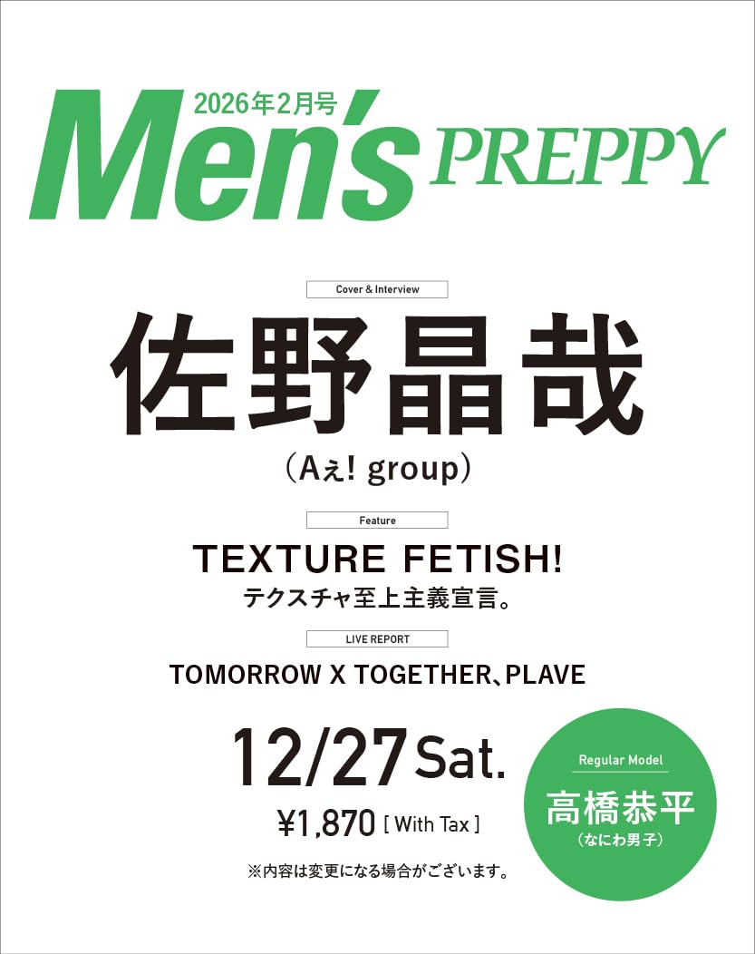 amazon.co.jp 【12/27発売】「Men’s PREPPY 2026年 2月号」表紙:佐野晶哉(Aぇ! group) ポストする シェアする LINEで送る 更新日 : 2025年12月17日(水) Men's PREPPY ヘリテージ 月刊(毎月1日) 公式サイト 公式SNS ▼バックナンバー Amazonで検索 楽天ブックスで検索 楽天市場で検索 Men’s PREPPY(メンズプレッピー) 2026年 2月号表紙・インタビュー佐野晶哉(Aぇ! group)レギュラーモデル高橋恭平(なにわ男子)特集GOALDEN TEXTUREテクスチャ至上主義宣言。 Amazonで見る楽天市場で見る 紙版を購入 販売期間や在庫状況により、リンク先のショップで購入できない場合があります。ご了承ください。
