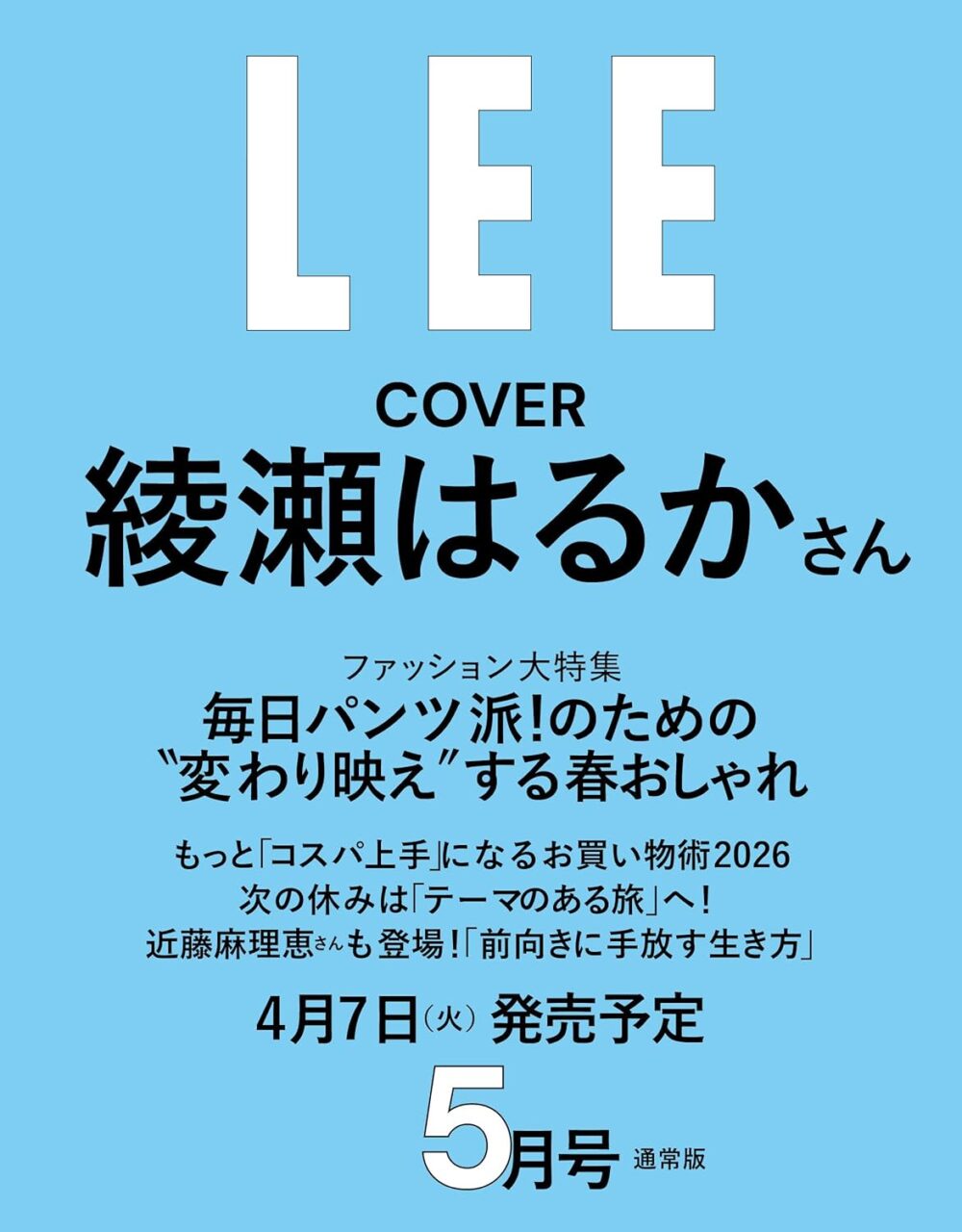 amazon.co.jp 【4/7発売】「LEE 2026年 5月号 特別版」表紙:目黒蓮(Snow Man) ポストする シェアする LINEで送る 更新日 : 2026年3月6日(金) LEE 集英社 月刊(毎月7日) 公式サイト 公式SNS ▼バックナンバー検索 Amazon 楽天ブックス 楽天市場 LEE(リー) 2026年 5月号 特別版 / 通常版【特別版】表紙目黒蓮(Snow Man)【通常版】表紙綾瀬はるかファッション大特集毎日パンツ派!のための“変わり映え”する春おしゃれ Amazonで見る楽天ブックスで見る楽天市場で見る 紙版を購入 販売期間や在庫状況により、リンク先のショップで購入できない場合があります。ご了承ください。