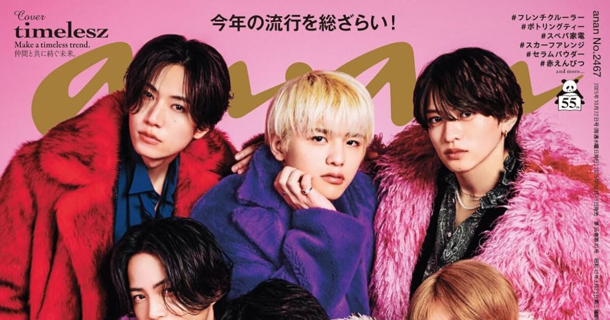 amazon.co.jp 【10/15発売】「anan No.2467」表紙:timelesz ポストする シェアする LINEで送る 更新日 : 2025年10月14日(火) anan マガジンハウス 週刊(毎週水曜日) 公式サイト 公式SNS ▼バックナンバー Amazonで検索 楽天ブックスで検索 楽天市場で検索 anan(アンアン) 2025年 10/22号 No.2467 通常版増刊 スペシャルエディション【通常版】表紙&グラビアtimelesz佐藤勝利・菊池風磨・松島聡・寺西拓人・原嘉孝・橋本将生・猪俣周杜・篠塚大輝Make a timeless trend.仲間と共に紡ぐ未来。【スペシャルエディション】表紙今田美桜凛として、強く特集今年の流行りモノ総決算!ananトレンド大賞2025 Amazonで見るKindle版(電子書籍)楽天ブックスで見る楽天Kobo版(電子書籍) 紙版を購入 電子書籍版を購入 販売期間や在庫状況により、リンク先のショップで購入できない場合があります。ご了承ください。