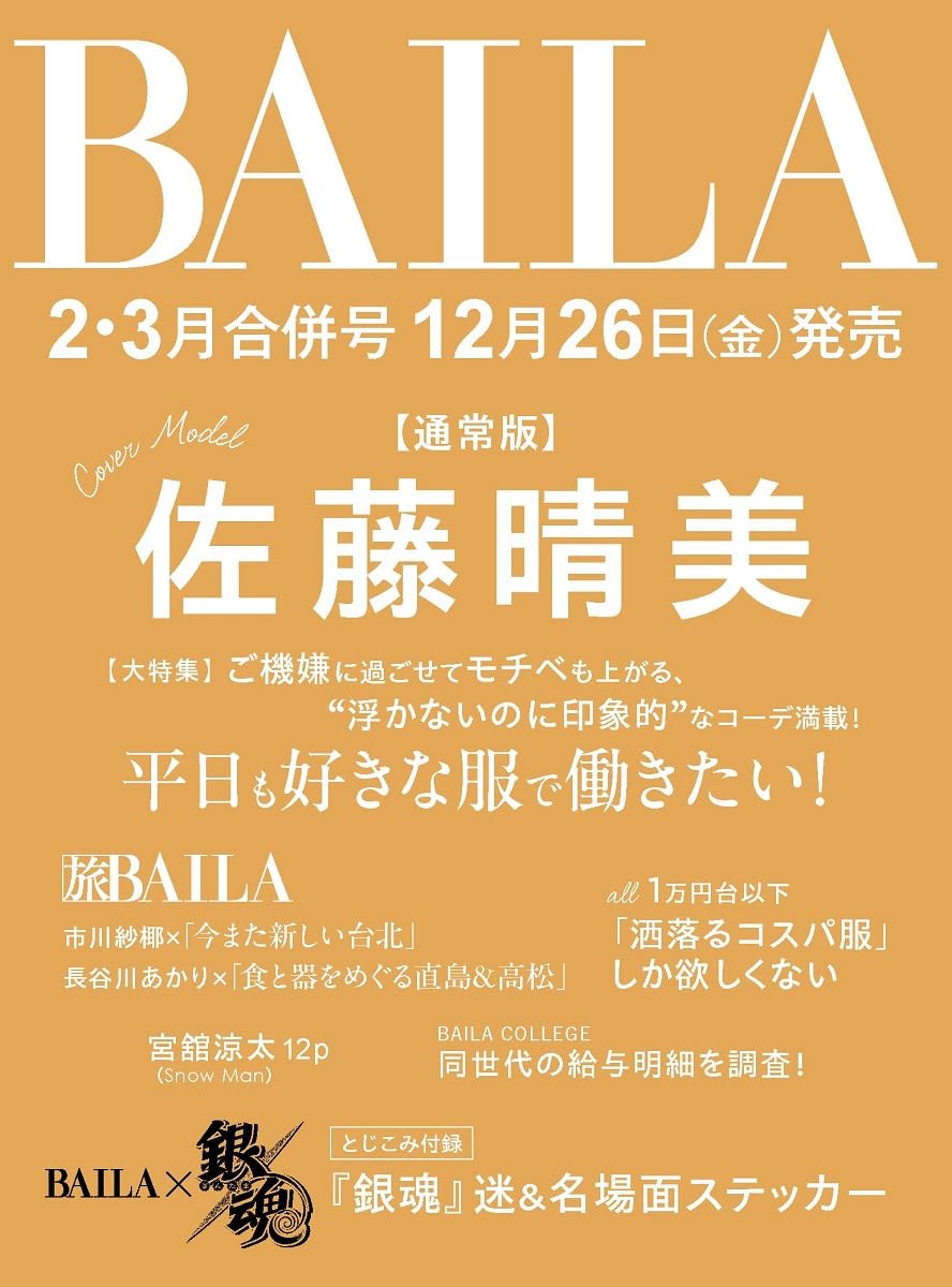 amazon.co.jp 【12/26発売】「BAILA 2026年 2・3月 合併号 特別版」表紙:宮舘涼太(Snow Man) ポストする シェアする LINEで送る 更新日 : 2025年12月19日(金) BAILA 集英社 月刊(毎月28日) 公式サイト 公式SNS ▼バックナンバー Amazonで検索 楽天ブックスで検索 楽天市場で検索 BAILA(バイラ) 2026年 2・3月 合併号 増刊 特別版 / 通常版【特別版】表紙宮舘涼太(Snow Man)【通常版】表紙佐藤晴美大特集平日も好きな服で働きたい!旅BAILA市川紗椰 × 「今また新しい台北」長谷川あかり × 「食と器をめぐる直島&高松」とじこみ付録『銀魂』迷&名場面ステッカー Amazonで見る楽天ブックスで見る楽天市場で見る 紙版を購入 販売期間や在庫状況により、リンク先のショップで購入できない場合があります。ご了承ください。