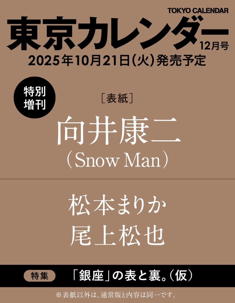 【10/21発売】「東京カレンダー 2025年 12月号 特別増刊」表紙:向井康二(Snow Man)